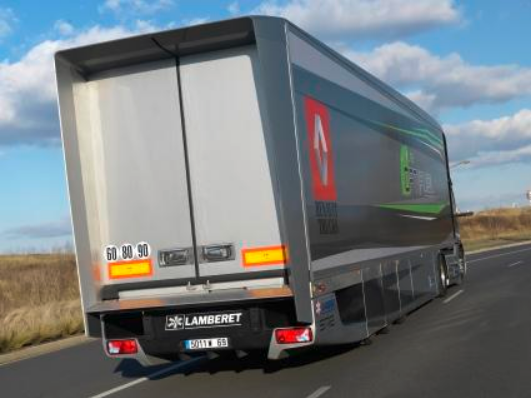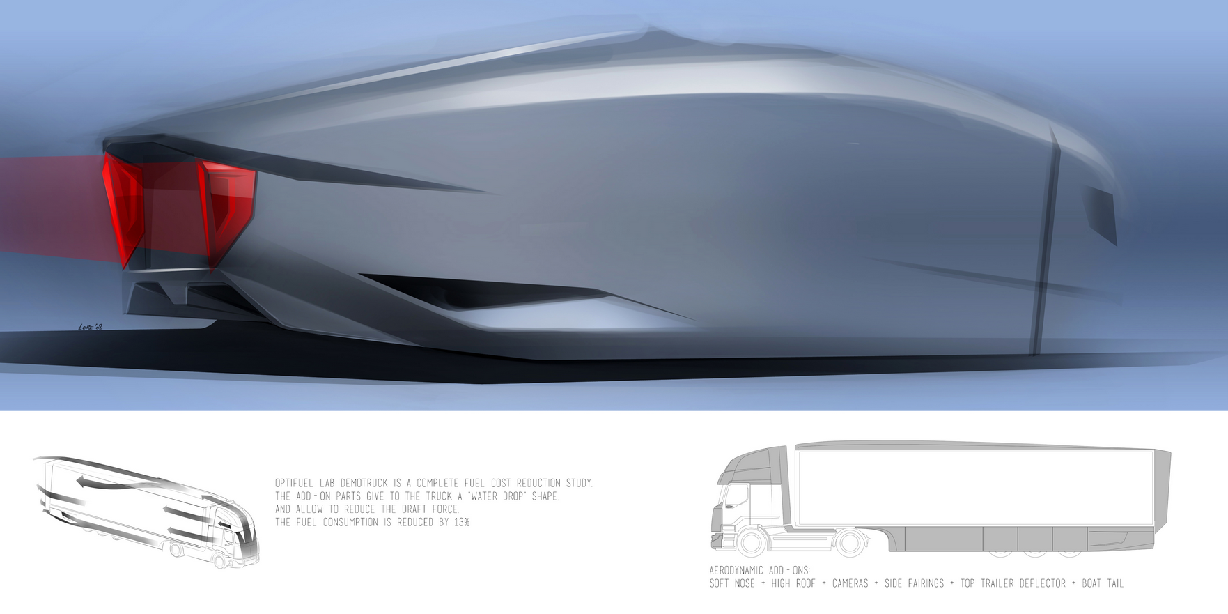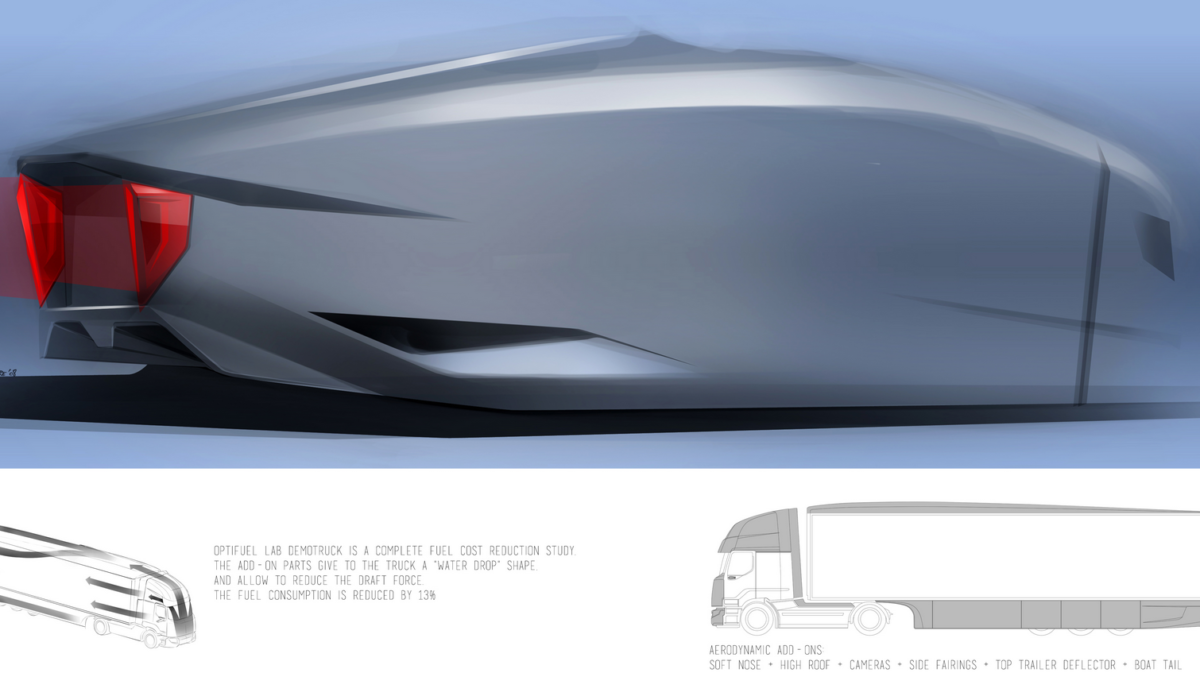 Pierwszy zakres prac, który można określić jako „w poszukiwaniu idealnego kształtu”, dotyczył kompleksowego podejścia do wyglądu zewnętrznego całego zestawu, tzn. zaproponowania rozwiązań aerodynamicznych obejmujących ciągnik i pochodzącą z firmy Lamberet 3-osiową naczepę chłodnię. Ten „idealny kształt” jest konieczny, gdyż jednym z podstawowych oporów, jaki musi pokonać poruszający się środek transportu, jest opór powietrza. W związku z tym, przyjmując za wzorcowy punkt odniesienia kształt kropli wody, czyli najbardziej aerodynamiczną formę występującą naturalnie w przyrodzie, zespół badawczy wprowadził wiele modyfikacji i usprawnień prowadzących do maksymalnego ograniczenia tego oporu. W aucie zmiany z zewnątrz w głównej mierze dotyczyły kabiny. Przedni zderzak uległ wydłużeniu o 30 cm. Dach ma nowy, bardziej obły kształt, dodatkowo pełni rolę spojera i został podwyższony, w rezultacie czego wysokość ciężarówki wynosi 4,16 m. Na miejsce zewnętrznych lusterek wstecznych pojawił się system badania tylnej półsfery, opracowany przez firmę Mekra, oparty o kamery i przeznaczony do obserwacji tego, co dzieje się z tyłu pojazdu. Zmieniono także kształt, wymiary i ułożenie poszczególnych spojlerów. Boczne, górne, montowane za kabiną zostały powiększone oraz ukształtowane i odchylone w taki sposób, by z jednej strony tworzyły całość z samochodem, z drugiej by w maksymalnie największym stopniu dało się uzyskać jednolitą bryłę całego zestawu. Boczne, dolne znajdują się zaś nie tylko między osiami ciągnika, ale i osłaniają całą dolną powierzchnię, łącznie z kołami naczepy. Dodatkowo spojlery te przechodzą w dyfuzory powietrza, zainspirowane rozwiązaniami pochodzącymi z Formuły 1 i służące do wyprowadzania na zewnątrz strumieni powietrza oraz zapewniające jak najmniejszy opór aerodynamiczny. Równie pożyteczną funkcję pełnią spojlery zamontowane z tyłu naczepy. Wystają one poza jej obrys, mają długość 70 cm i pozwalają na maksymalne ograniczenie strefy turbulencji, nieuchronnie powstającej za samochodem w trakcie jazdy i działającej hamująco na jego ruch. Jej zmniejszenie oznacza zatem zmniejszenie siły potrzebnej do napędu, co z kolei przekłada się na mniejsze zapotrzebowanie na energię. To ostatnie wiąże się już oczywiście nierozerwalnie z obniżeniem zużycia paliwa.