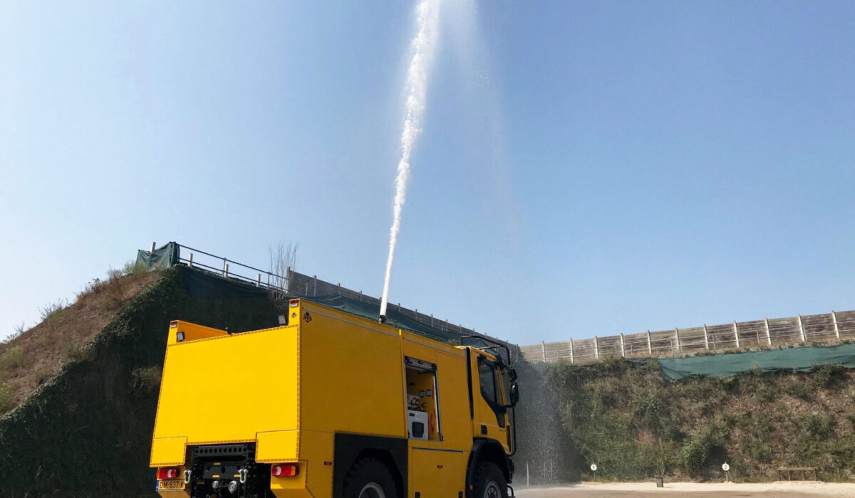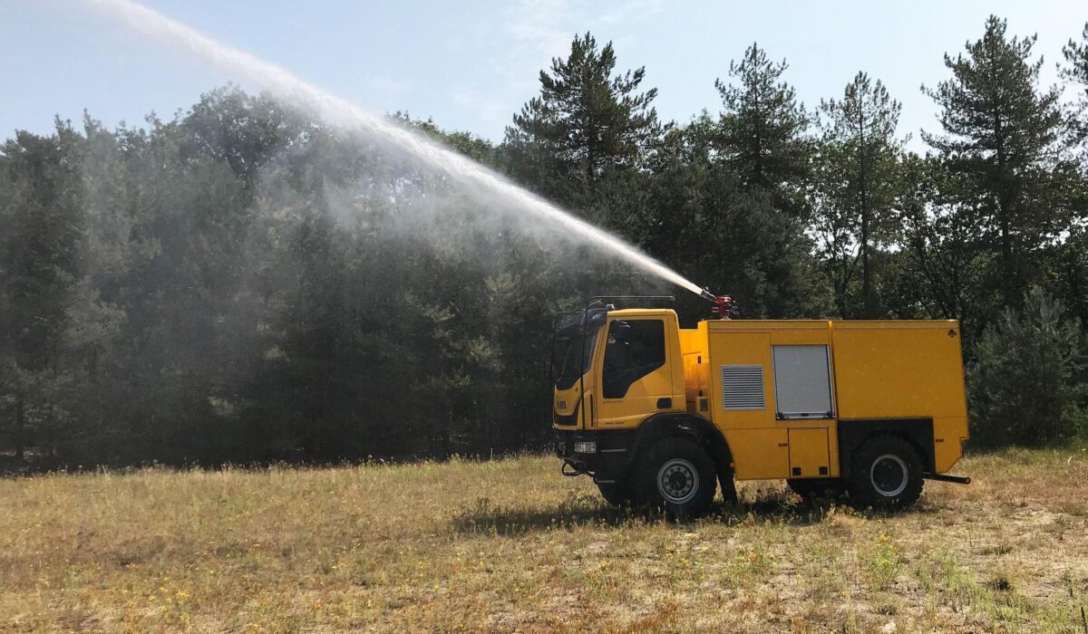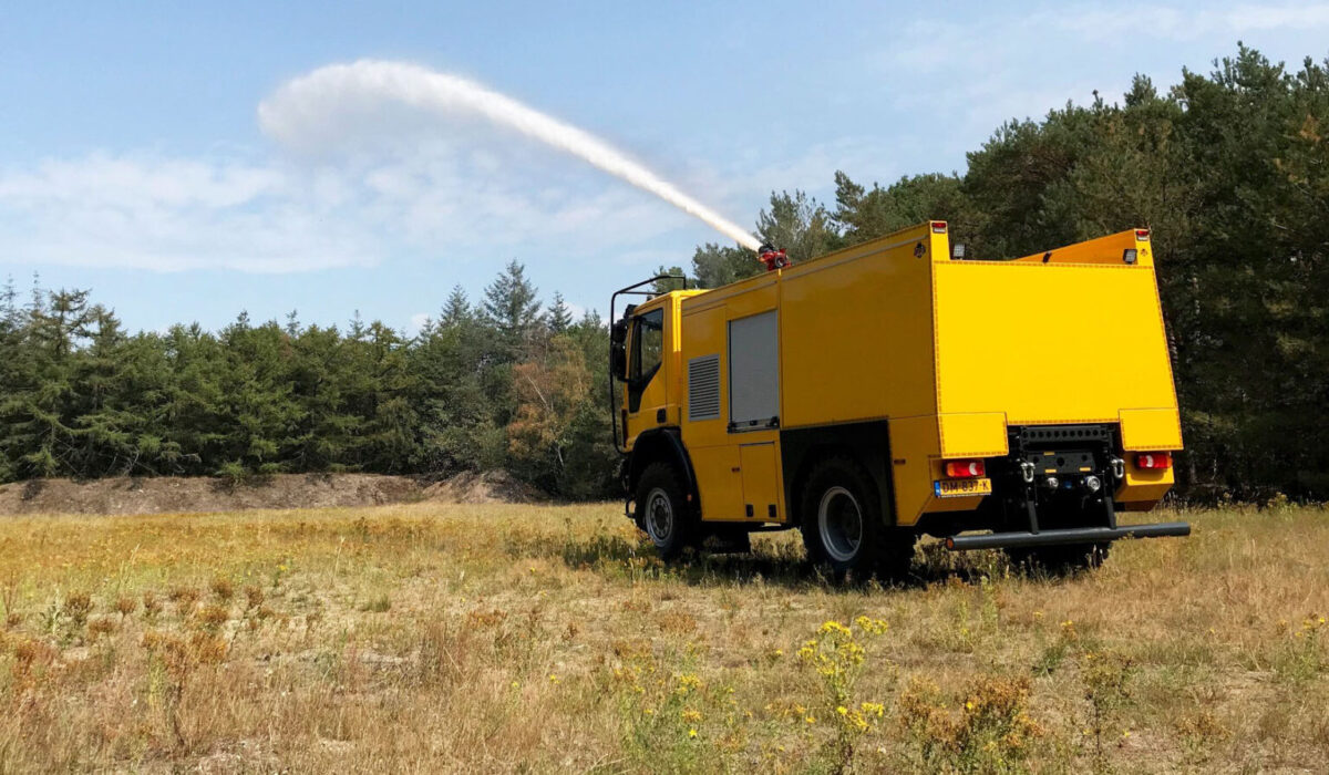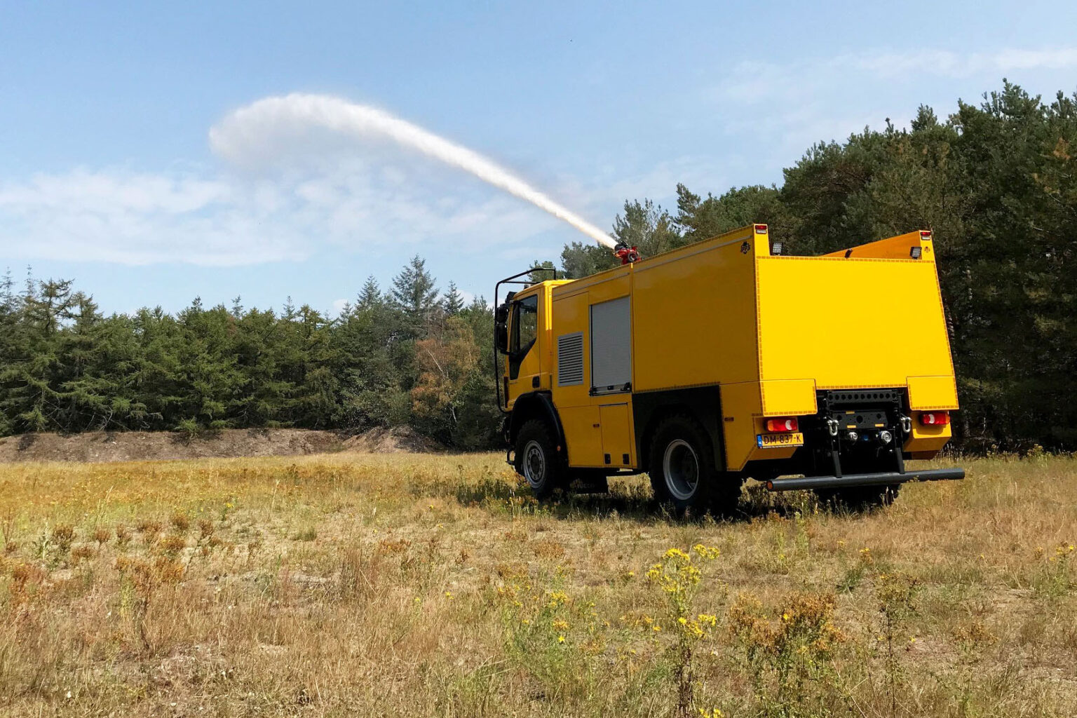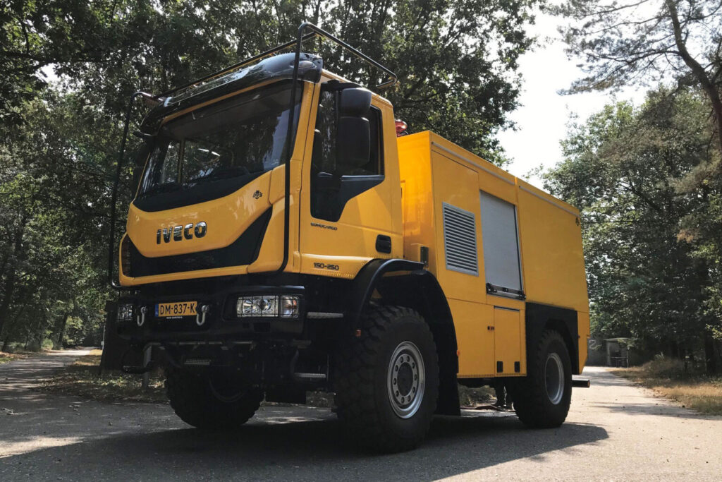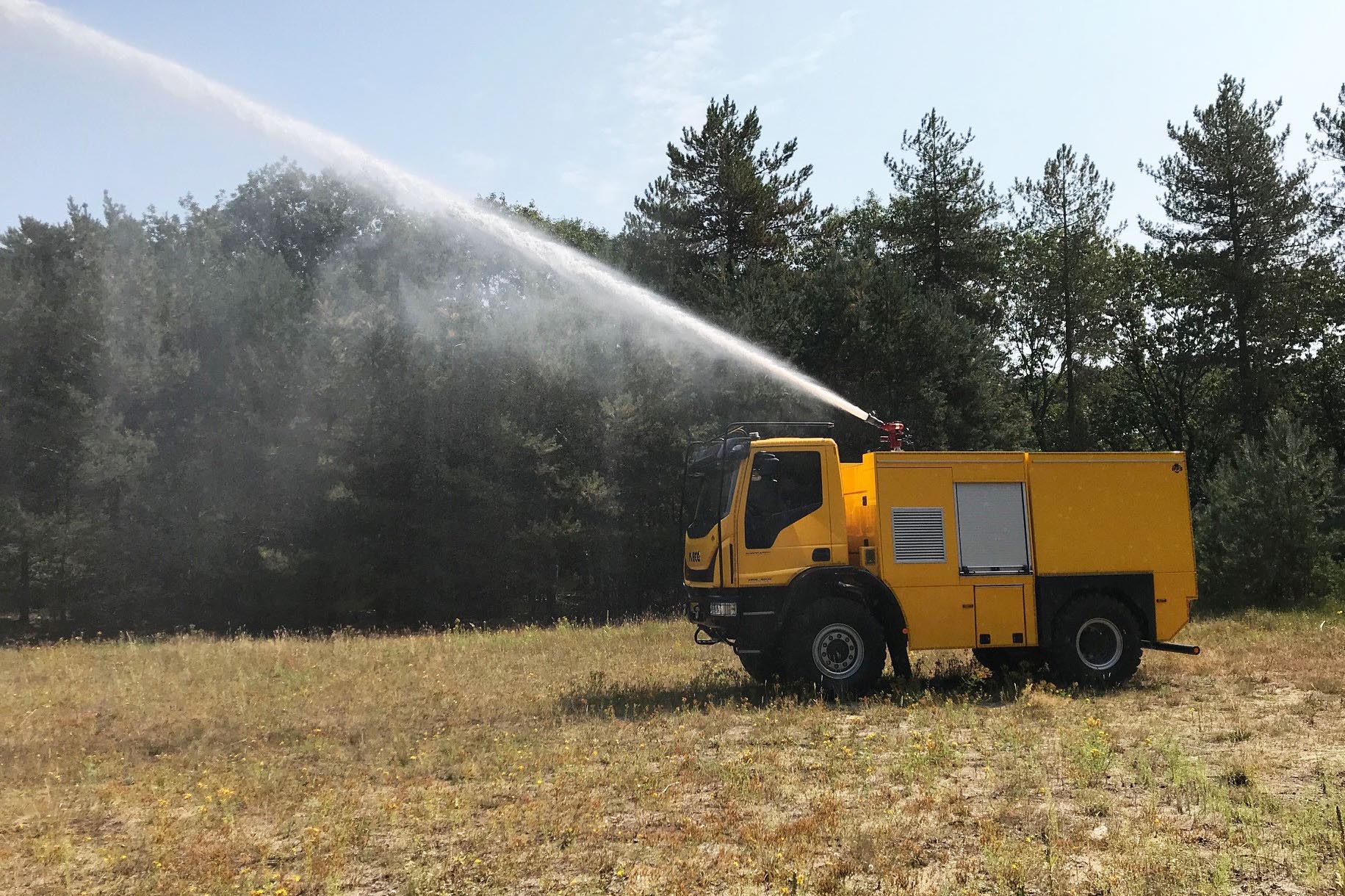 Iveco Eurocargo z kabiną dzienną jest wyposażone w dwa systemy zraszania, zbiornik na wodę o pojemności 4500 litrów i pompę napędzana przez niezależny silnik Deutz TCD 3.6 L4. Aby utrzymać wilgotność terenu do ostrzału. Ministerstwo Obrony stosuje między innymi system zraszania pod przednim zderzakiem. Zapewnia to równomierne podlewanie na szerokości co najmniej 3 metrów. Można również korzystać z działka dachowego. Ma ono zasięg 50 metrów, z łatwością pokrywając 10-metrowe nasypy. Po naciśnięciu przycisku pojazd jest gotowy do natychmiastowego użycia środków gaśniczych. Wydajność pompy pożarniczej wynosi 2000 l/min przy ciśnieniu 10 barów, co pozwala Ministerstwu Obrony na korzystanie z wydajnego pojazdu gaśniczego. Pojazd utrzymuje również teren w stanie wilgotnym, zapobiegając pożarom lasów. Zewnętrzne systemy napełniania znajdują się na strzelnicy Reek, co pozwala Ministerstwu Obrony na sprawne napełnianie zbiornika pojazdu gaśniczego.