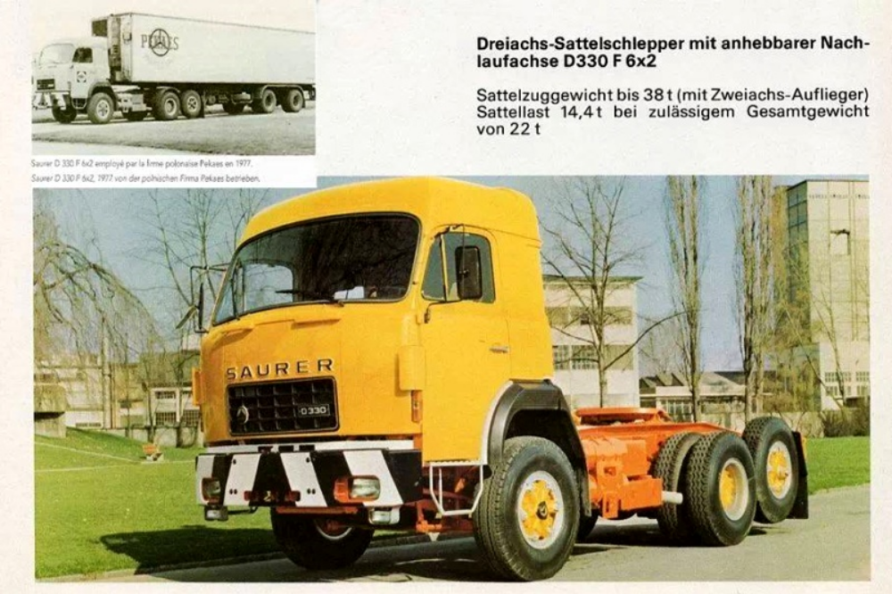 Model D330 był produkowany przez Saurera w latach 1976-1982, a zatem do końca istnienia firmy. Gdy był komercjalizowany, dzięki nowym silnikom wytwórca uzupełnił swoją gamę mocy, oferując ekonomiczne rozwiązanie do każdego zastosowania. Do wyboru były jednostki o mocy maksymalnej 180, 230, 290 i 330 KM. Ulepszenia zostały wprowadzone również na zewnątrz: wszystkie pojazdy otrzymały nową, efektowną osłonę chłodnicy. Przednie i boczne szyby powiększono, co ogólnie poprawiło widoczność. Liczne ulepszenia pojawiły się także wewnątrz kabiny kierowcy. Kiedy jednak D330 F 6×2 znalazł się w Polsce w 1977 rok, nic nie zapowiadało takiego końca i tego modelu, i jego producenta.. Saurer był wtedy uznanym małym wytwórcą solidnych ciężarówek, może pozbawionych fajerwerków technicznych, ale wyróżniających się bardzo wysoką jakością wykonania oraz legendarną wręcz trwałością – było to w takim typowo szwajcarskie dobro z najwyższej półki. Krążyły nawet opinie, że Saurer to taki ciężarówkowy Rolls-Royce. Tylko że Rolls-Royce mógł być rzadki w klasie produktów premium, a Saurer musiał walczyć z klasycznymi pochodzeniowymi nieraz plebejuszami. I tę walkę ostatecznie przegrał, o czym poniżej..